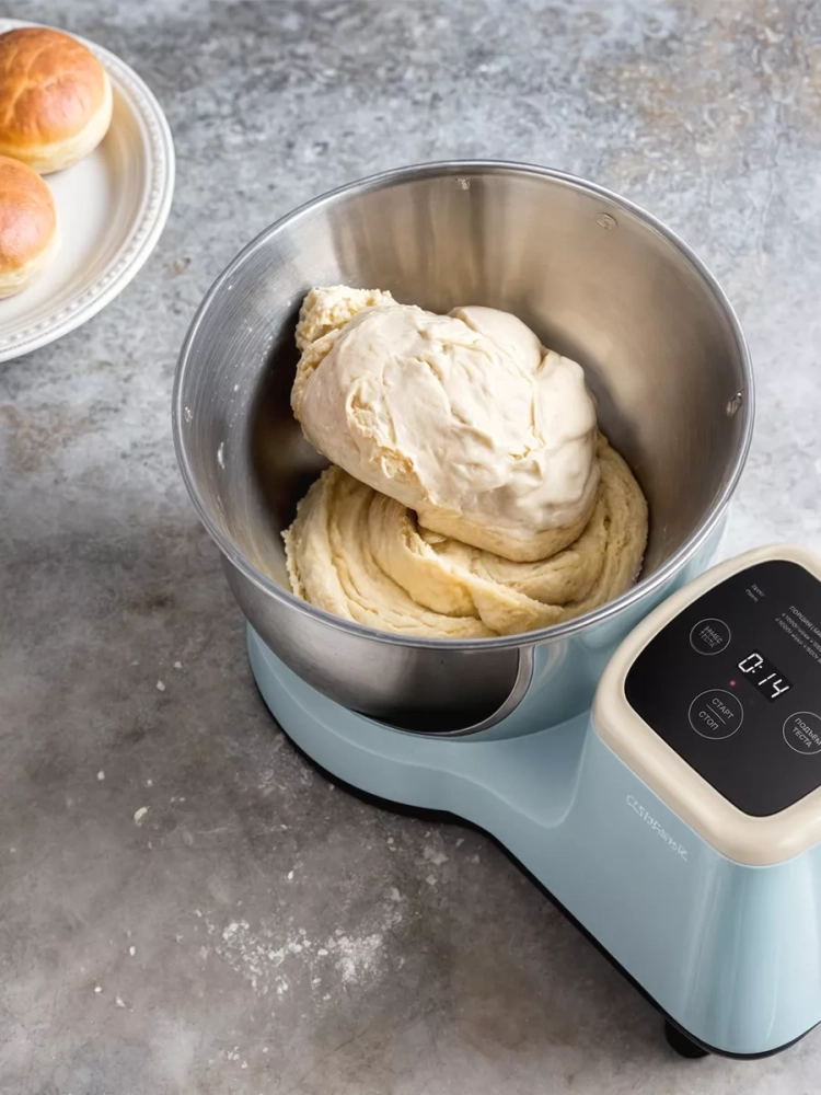 Управление прибором осуществляется с помощью сенсорных кнопок на панели управления. Также есть дисплей, на котором отображается время работы прибора. Тестомесильная машина может работать в автоматическом режиме. Вам достаточно только положить ингредиенты, надеть насадку и установить время замеса: от 5 до 15 минут с шагом 2 минуты. После того, как прибор замесит тесто, тесто можно оставить на расстойку прямо в чаше и выбрать время от 10 до 30 минут с шагом 10 минут или от 45 минут до 1 часа 45 минут с шагом 15 минут. Дно чаши будет нагреваться, температура нагрева варьируется от 30 до 40 °С. Во время расстойки тесто поднимается и увеличивается в объеме. По окончании времени прибор подаст звуковой сигнал и автоматически прекратит работу.