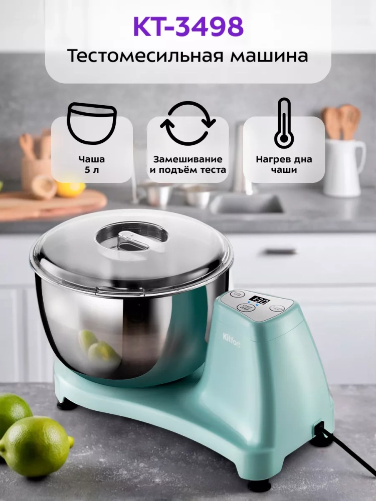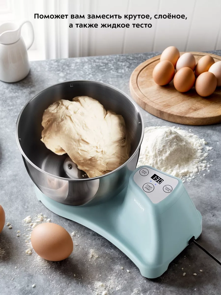 Тестомесильная машина Kitfort КТ-3498 поможет вам замесить крутое тесто для пельменей и пирогов, слоеное тесто для булочек, а также жидкое тесто для блинов.