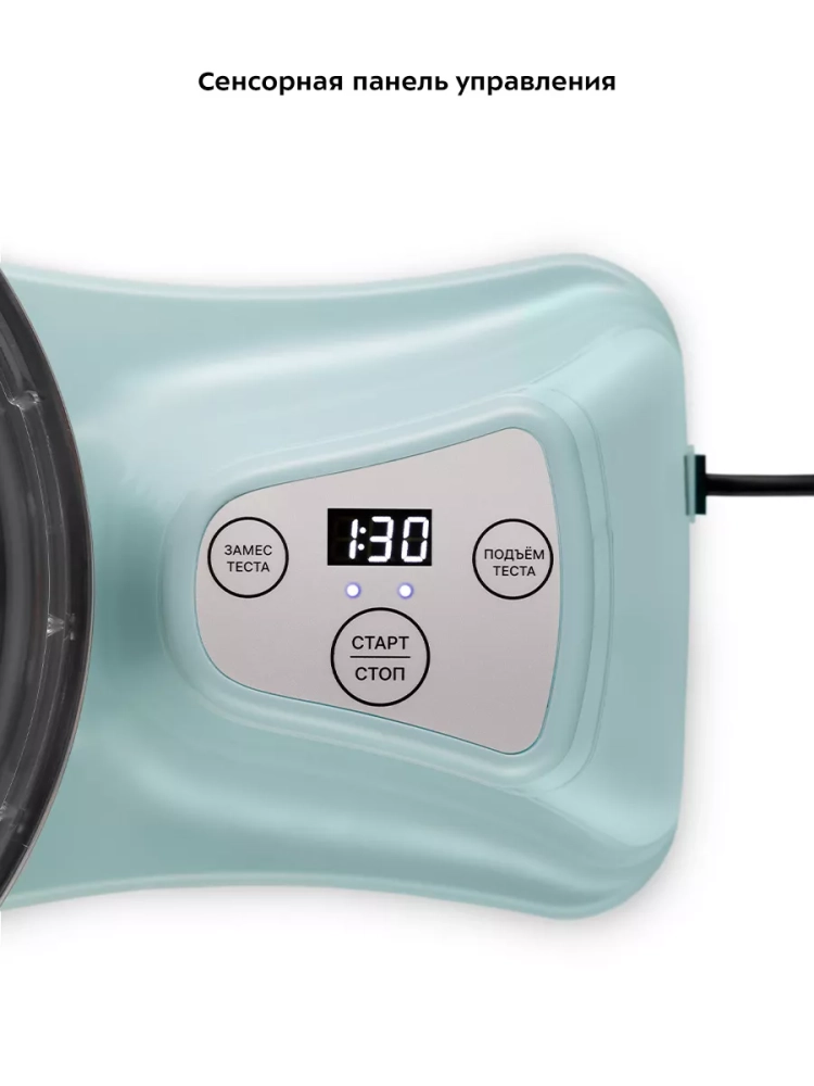 Управление прибором осуществляется с помощью сенсорных кнопок на панели управления. Также есть дисплей, на котором отображается время работы прибора. Тестомесильная машина может работать в автоматическом режиме. Вам достаточно только положить ингредиенты, надеть насадку и установить время замеса: от 5 до 15 минут с шагом 2 минуты. После того как прибор замесит тесто, его можно оставить на расстойку прямо в чаше и выбрать время от 10 до 30 минут с шагом 10 минут или от 45 минут до 1 часа 45 минут с шагом 15 минут. Дно чаши будет нагреваться, температура нагрева варьируется от 30 до 40 °С. Во время расстойки тесто поднимается и увеличивается в объеме. По окончании времени расстойки прибор подаст звуковой сигнал и автоматически прекратит работу.