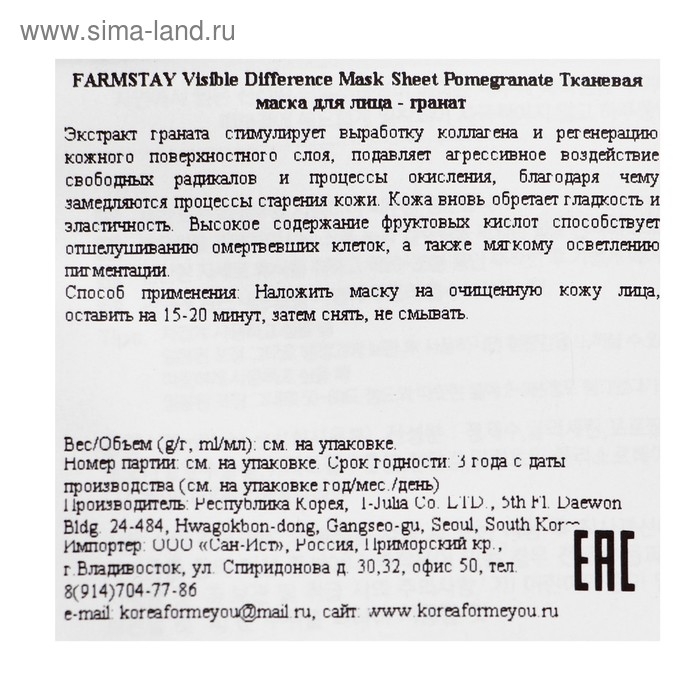 Тканевая маска с натуральным экстрактом граната Farmstay, 23 мл