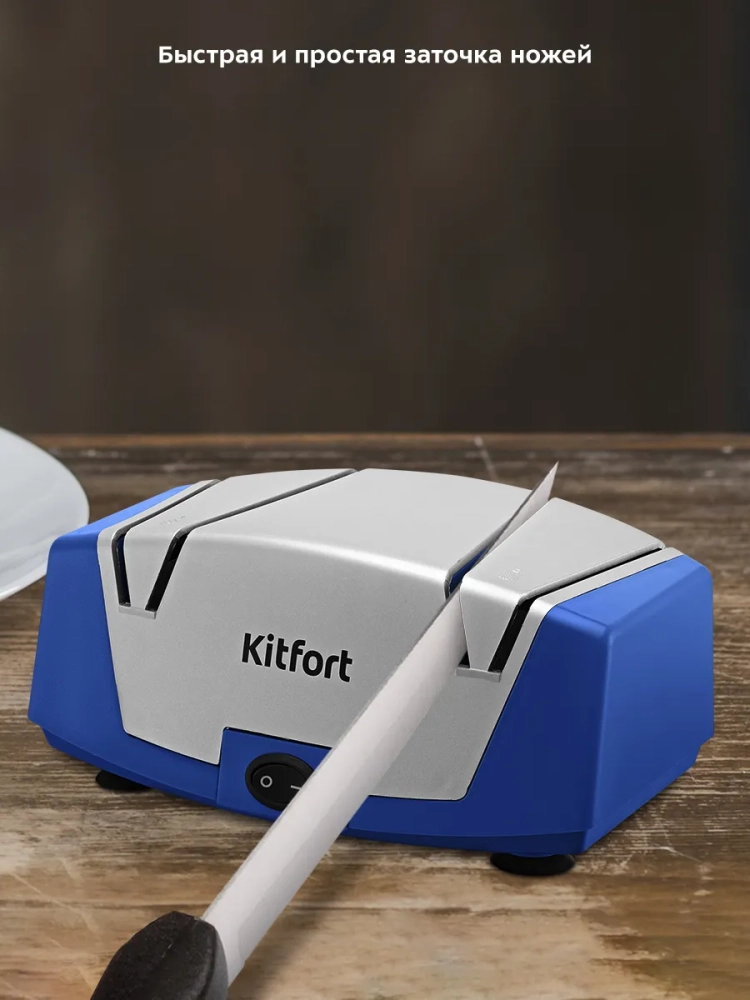 Электроточилка для ножей Kitfort КТ-6391 поможет быстро и безопасно заточить ножи с гладкими стальными лезвиями.