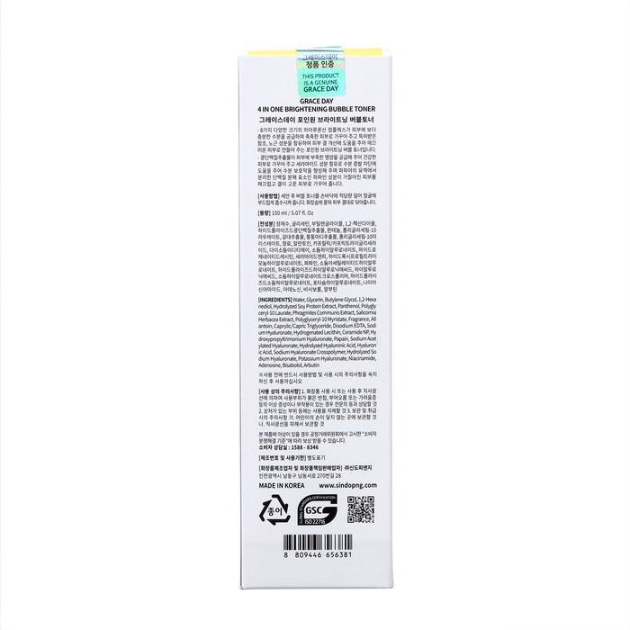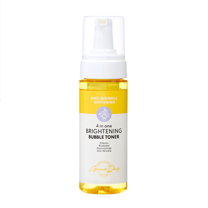 Пузырьковый тонер который предназначен для осветления и подтяжки кожи лица. Арбутин противостоит первым признакам увядания кожи, бисаболол и ниацинамид осветляют кожу. Содержит 8 различных размеров комплекс с гиалуроновой кислотой, обеспечивает больше влаги для кожи, чтобы сделать ее влажной, также запатентованные ингредиенты зеленого чая и ногеуна, которые помогают улучшить текстуру кожи и сделать кожу гладкой. Экстракт соевого белка обеспечивает кожу недостаточным питанием, чтобы сделать ее здоровой, содержит керамиды, которые помогают блокировать испарение влаги, образуя барьер для влаги, а папаин, протеолитический фермент, выделенный из молока папайи, делает грубую кожу гладкой и мягкой.