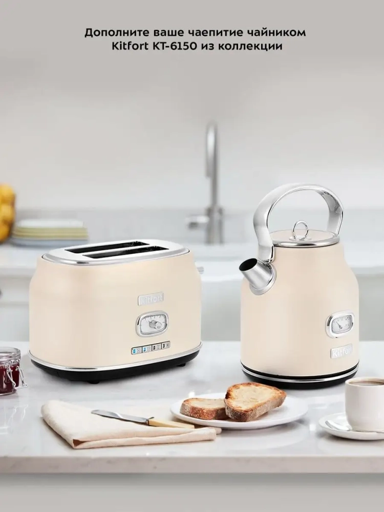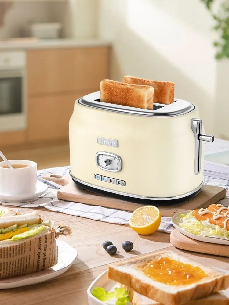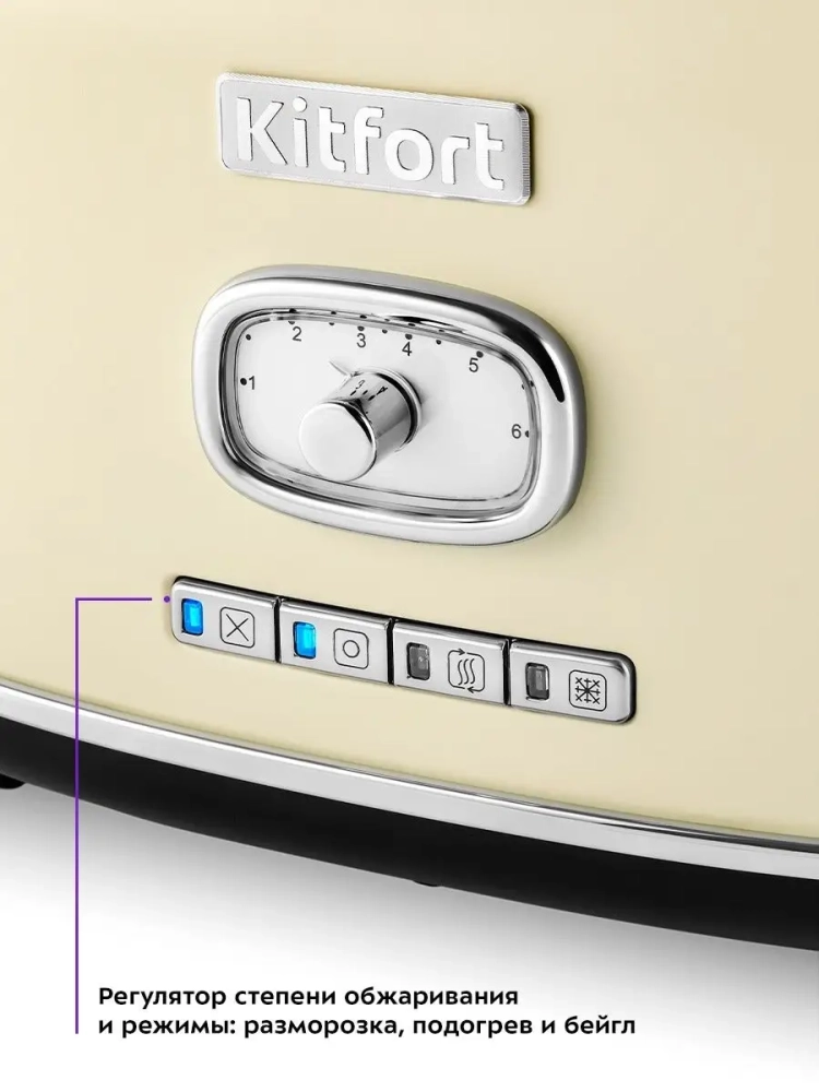 Тостер Китфорт оснащен поворотным регулятором степени обжаривания и четырьмя кнопками со световыми индикаторами. Режим подогрева служит для подогрева уже готовых тостов, если они остыли. Режим разморозки позволяет приготовить тосты из замороженного хлеба. Режим Бейгл позволяет поджарить рогалики или другие мучные изделия, которые требуют более интенсивной прожарки. Благодаря широким слотам можно поджаривать толстые куски хлеба, а не только тонкие. Загруженные тосты автоматически центрируются, чтобы их обжарка с двух сторон была равномерной независимо от толщины куска. По окончании приготовления тостер автоматически отключается, а тосты поднимаются вверх, чтобы их было удобнее извлечь. Вы можете приготовить 1 или 2 тоста одновременно.