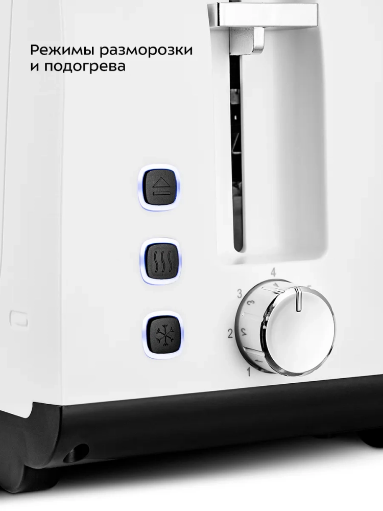 Тостер оснащен поворотным регулятором степени обжаривания и тремя кнопками. Режим подогрева служит для подогрева уже готовых тостов, если они остыли. Режим разморозки позволяет приготовить тосты из замороженного хлеба.