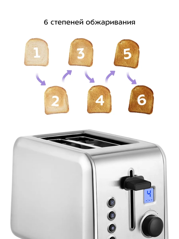 Загруженные тосты автоматически центрируются, чтобы их обжаривание с двух сторон было равномерным независимо от толщины куска. По окончании приготовления тостер автоматически отключается, а тосты поднимаются вверх, чтобы их было удобнее извлечь. Механизм экстра-подъема позволяет выше приподнять тосты небольшого размера для их удобного извлечения. Вы можете приготовить 1 или 2 тоста одновременно.