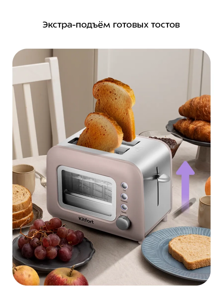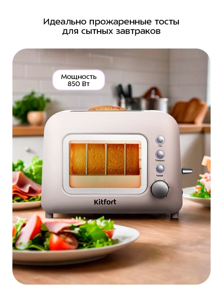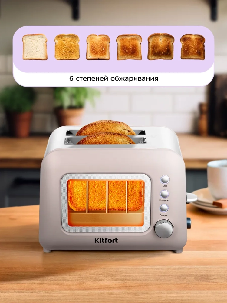 Электрический тостер Kitfort КТ-6413 создан для тех, кто любит полакомиться ароматным и хрустящим горячим поджаренным хлебом. Особый вкус и цвет корочки тостов получаются такими благодаря карамелизации сахара, содержащегося в муке, при инфракрасном нагреве в процессе приготовления. Благодаря смотровому окошку тостера вы можете наблюдать за процессом приготовления.