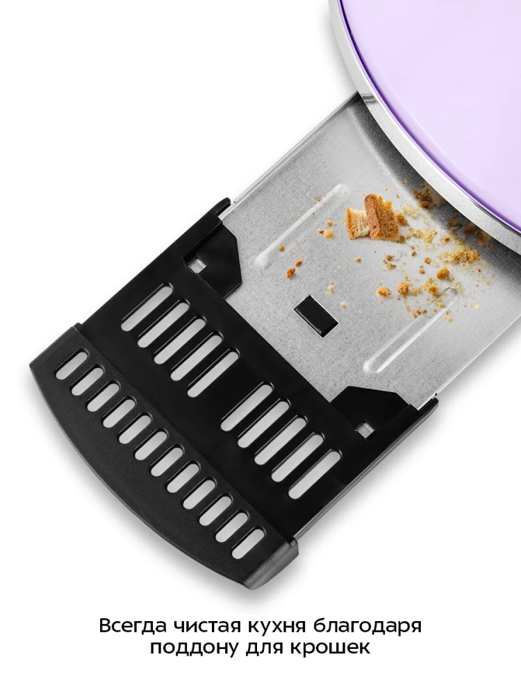 Корпус прибора выполнен из пластика со вставками из металла. Съемный поддон для крошек позволяет легко очистить тостер от хлебных крошек. Для удобного хранения на дне устройства предусмотрены держатели для шнура питания. Противоскользящие вставки на ножках делают тостер более устойчивым.