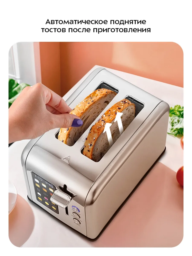 Загруженные тосты автоматически центрируются, чтобы их обжарка с двух сторон была равномерной независимо от толщины куска. По окончании приготовления тостер автоматически отключается, а тосты поднимаются вверх, чтобы их было удобнее извлечь. Вы можете приготовить 1 или 2 тоста одновременно.