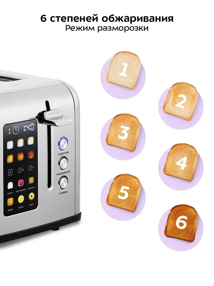 Тостер оснащен панелью управления с сенсорными кнопками и дисплеем. В данной модели предусмотрено 6 программ для обжаривания различных мучных изделий: «Белый», «Без глютена», «Зерновой», «Вафли», «Булка», «Бейгл». Программы отличаются временем приготовления: для получения желаемой степени обжаривания разную выпечку необходимо поджаривать разное время. Для каждой программы можно выбрать одну из 6 степеней обжаривания. Вы также можете изменить предустановленное время приготовления на 15 секунд в большую или меньшую сторону вручную. Специальная кнопка позволяет скорректировать нагрев и избежать пережаривания хлеба, если вы используете только один слот. Режим подогрева служит для подогрева уже готовых тостов, если они остыли. Режим разморозки позволяет приготовить тосты из замороженного хлеба.