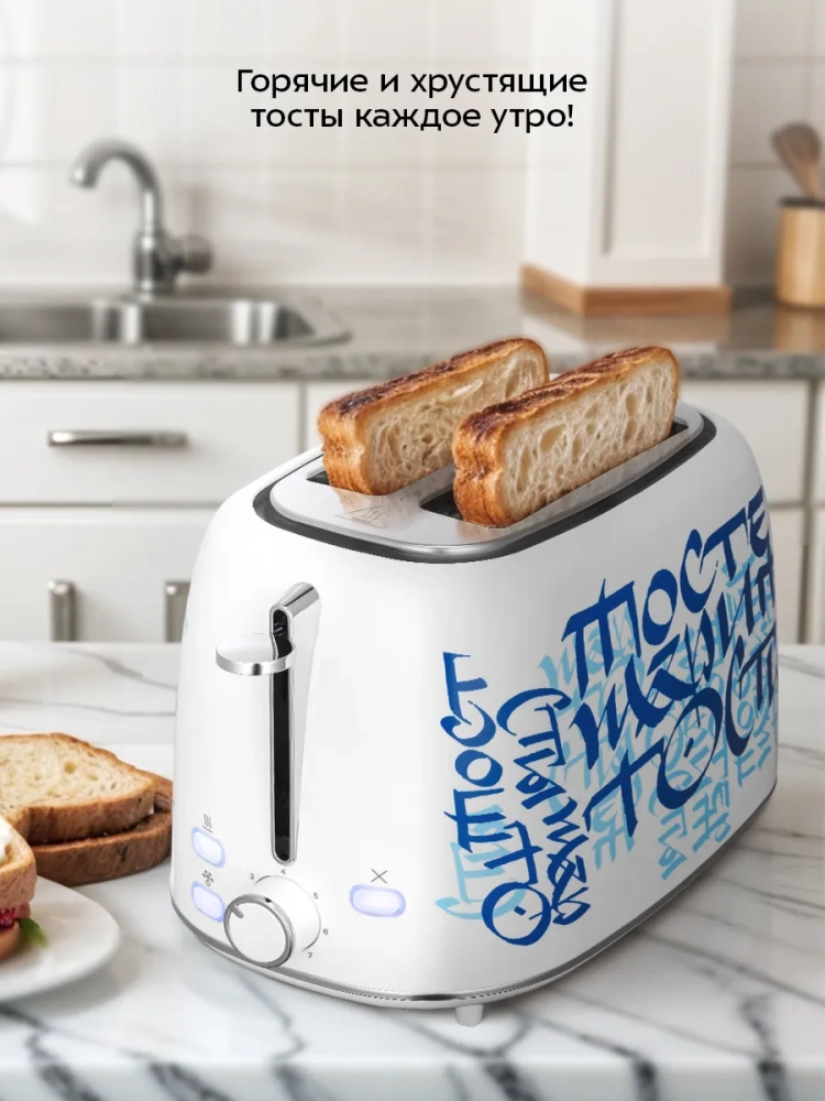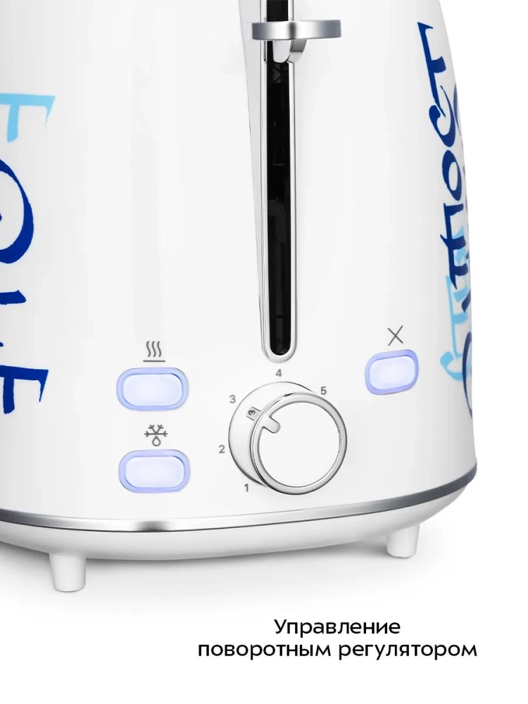Тостер оснащен регулятором степени обжаривания и тремя кнопками со световыми индикаторами. Режим «Разогрев» служит для подогрева уже готовых тостов, если они остыли. Режим «Разморозка» позволяет приготовить тосты из замороженного хлеба. По окончании приготовления тостер автоматически отключается, а тосты поднимаются вверх, чтобы их было удобнее извлечь.