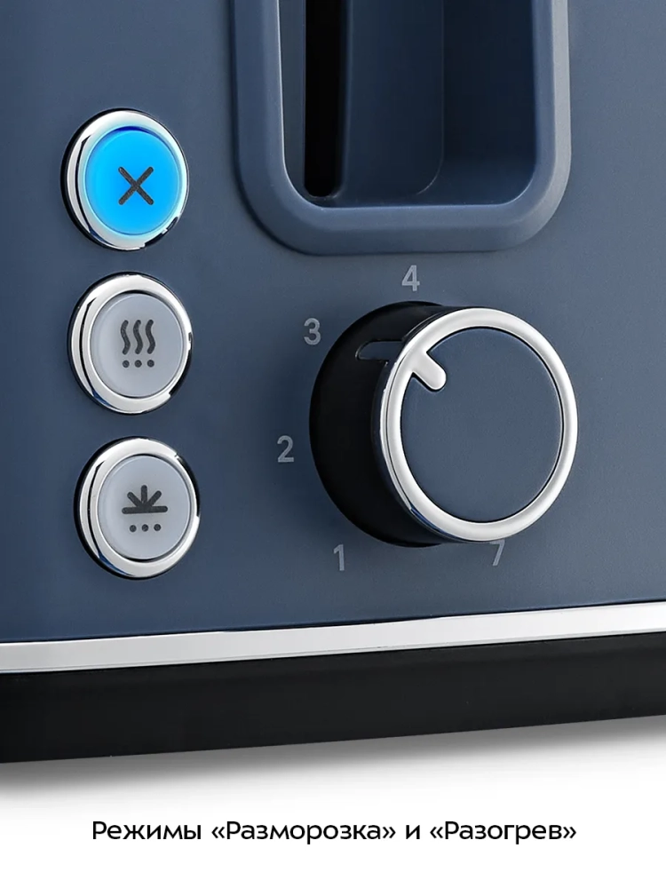 Тостер оснащен регулятором степени обжаривания и тремя кнопками со световыми индикаторами. Режим «Разогрев» служит для подогрева уже готовых тостов, если они остыли. Режим «Разморозка» позволяет приготовить тосты из замороженного хлеба. По окончании приготовления тостер автоматически отключается, а тосты поднимаются вверх, чтобы их было удобнее извлечь.