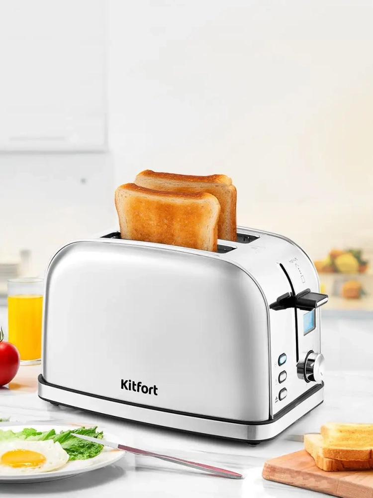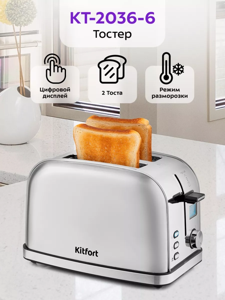 Электрический тостер Kitfort КТ-2036 создан для тех, кто любит полакомиться ароматным и хрустящим горячим поджаренным хлебом. Особый вкус и цвет корочки тостов получаются такими благодаря карамелизации сахара, содержащегося в муке, при инфракрасном нагреве в процессе приготовления. Тостер оснащен поворотным регулятором степени обжаривания, тремя кнопками со световыми индикаторами и жидкокристаллическим дисплеем. Режим разогрева служит для разогрева уже готовых тостов, если они остыли. Режим разморозки позволяет приготовить тосты из замороженного хлеба. Загруженные тосты автоматически центрируются, чтобы их обжарка с двух сторон была равномерной. Оставшееся время показывается на жидкокристаллическом дисплее и позволяет рассчитать приготовление чашки кофе или чая, пока готовится тост. По окончании приготовления тостер автоматически отключается, а тосты поднимаются вверх, чтобы их было удобнее извлечь. Вы можете приготовить 1 или 2 тоста одновременно.