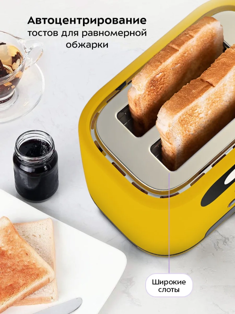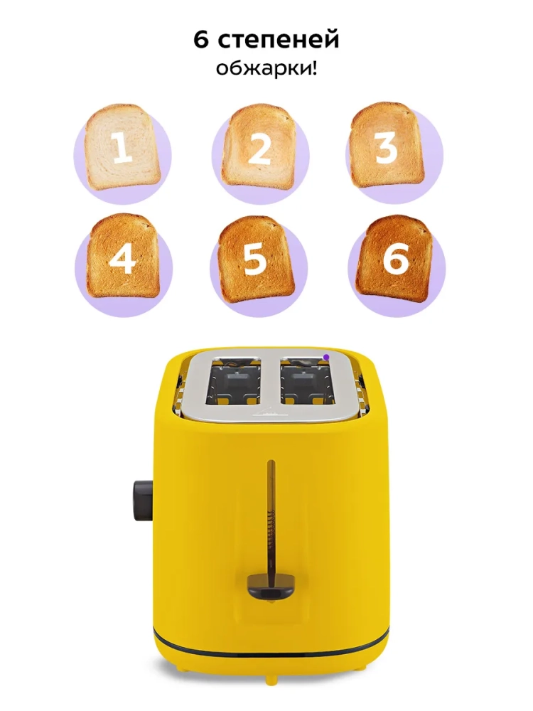 Тостер оснащен поворотным регулятором степени обжаривания и тремя кнопками со световыми индикаторами. Режим подогрева служит для подогрева уже готовых тостов, если они остыли. Режим разморозки позволяет приготовить тосты из замороженного хлеба. Загруженные тосты автоматически центрируются, чтобы их обжарка с двух сторон была равномерной независимо от толщины куска. По окончании приготовления тостер автоматически отключается, а тосты поднимаются вверх, чтобы их было удобнее извлечь. Механизм экстра-подъема позволяет приподнять выше тосты небольшого размера для их удобного извлечения. Вы можете приготовить 1 или 2 тоста одновременно.
