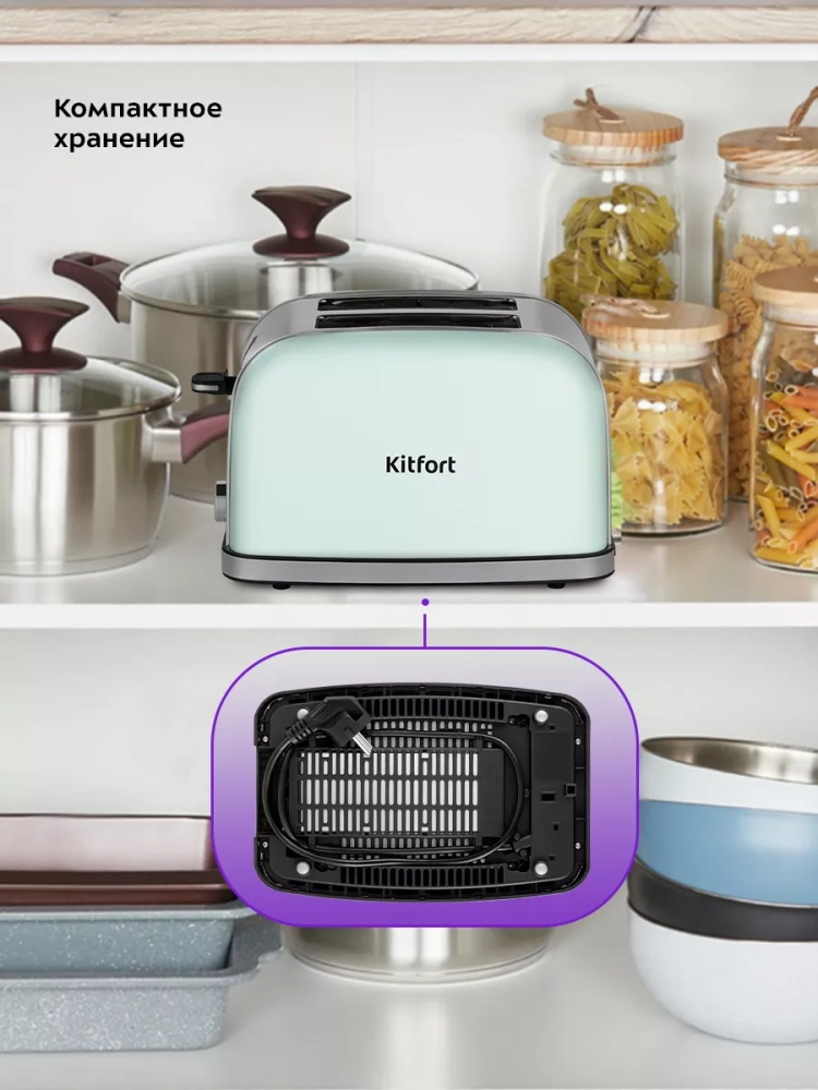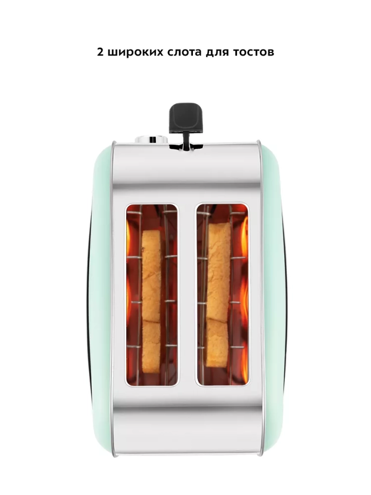 По окончании приготовления тостер автоматически отключается, а тосты поднимаются вверх, чтобы их было удобнее извлечь. Механизм экстра-подъема позволяет приподнять выше тосты небольшого размера для их удобного извлечения. Вы можете приготовить 1 или 2 тоста одновременно.