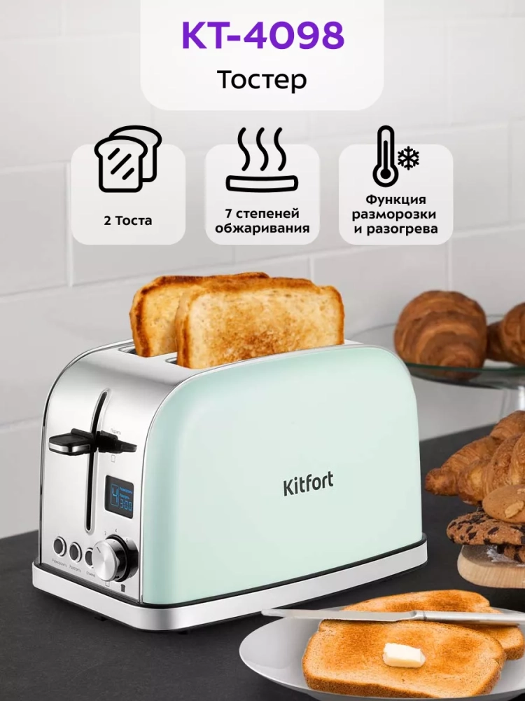 Электрический тостер Kitfort КТ-4098 создан для тех, кто любит полакомиться ароматным и хрустящим горячим поджаренным хлебом. Особый вкус и цвет корочки тостов получаются такими благодаря карамелизации сахара, содержащегося в хлебе, при инфракрасном нагреве в процессе приготовления.