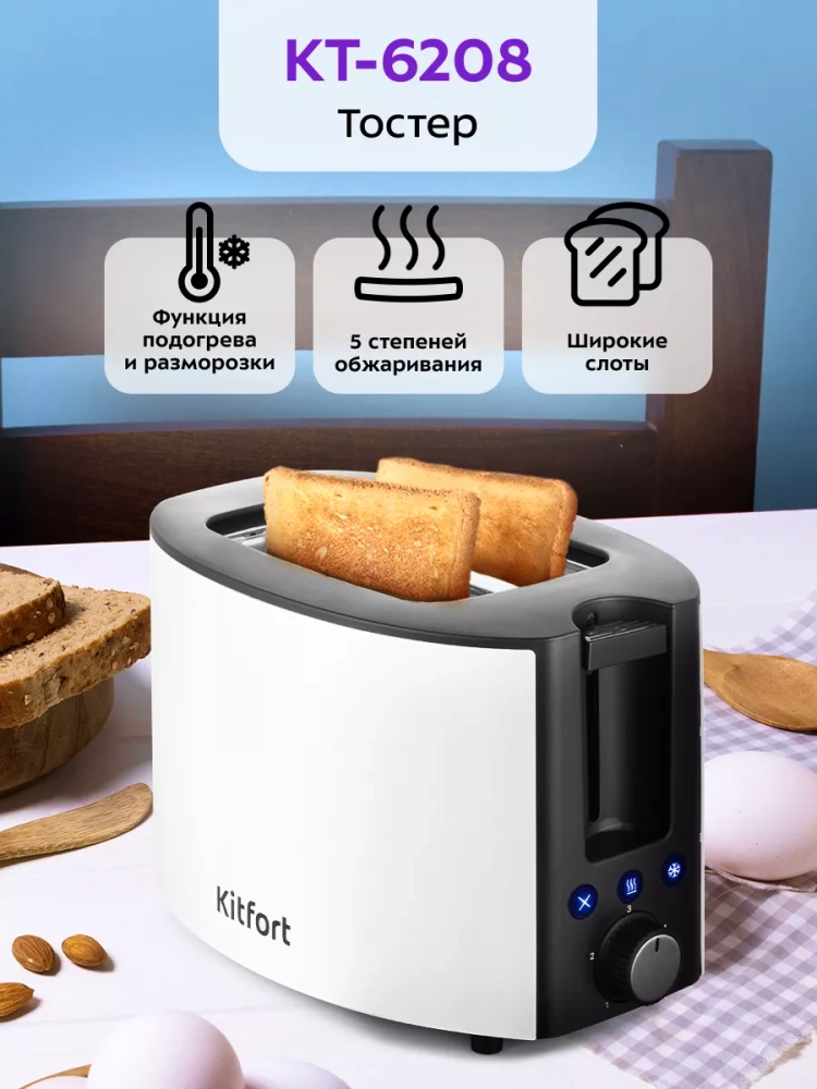 Электрический тостер Kitfort КТ-6208 создан для тех, кто любит полакомиться ароматным и хрустящим горячим поджаренным хлебом. Особый вкус и цвет корочки тостов получаются такими благодаря карамелизации сахара, содержащегося в тесте, при инфракрасном нагреве в процессе приготовления.