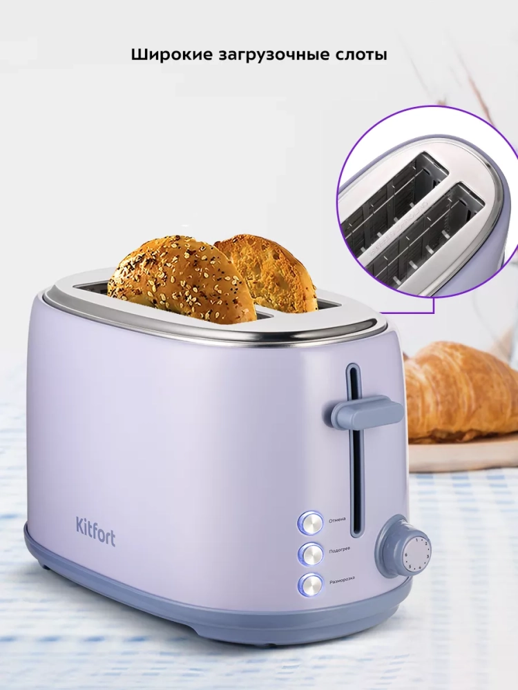 Загруженные тосты автоматически центрируются, чтобы их обжарка с двух сторон была равномерной независимо от толщины куска. Благодаря широким слотам можно поджаривать толстые куски хлеба, а не только тонкие. По окончании приготовления тостер автоматически отключается, а тосты поднимаются вверх, чтобы их было удобнее извлечь. Механизм экстра-подъема позволяет приподнять тосты выше для удобного извлечения тостов небольшого размера. Вы можете приготовить 1 или 2 тоста одновременно. Тостер имеет съемную подставку для подогрева, на которую мы можете положить булочки, круассаны и другую выпечку, чтобы подогреть их.
