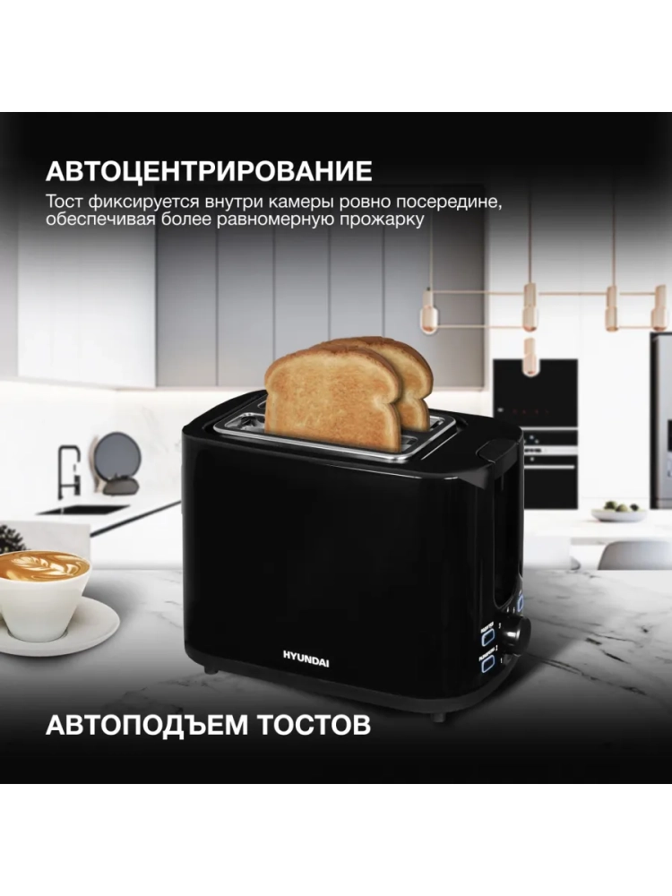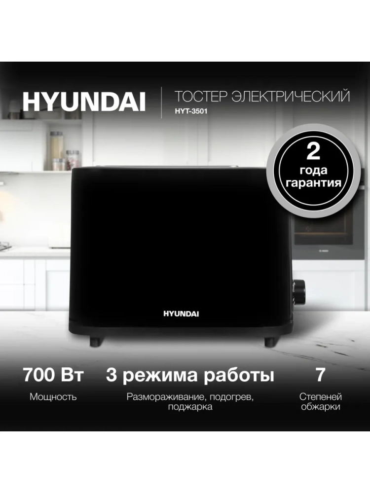 Тостер Hyundai HYT-3501 черный, мощность 900Вт, количество отделений: 2, длина сетевого шнура 0.75м.
