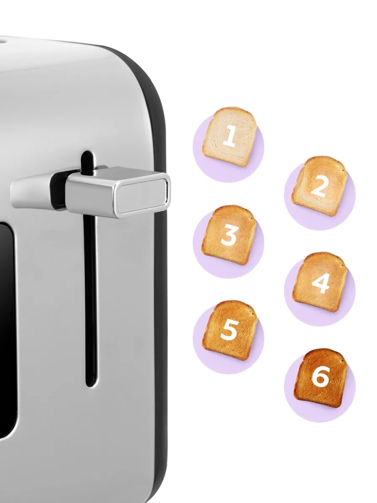 По окончании приготовления тостер автоматически отключается, а тосты поднимаются вверх, чтобы их было удобнее извлечь. Механизм экстра-подъема позволяет приподнять выше тосты небольшого размера для их удобного извлечения. Вы можете приготовить 1 или 2 тоста одновременно.