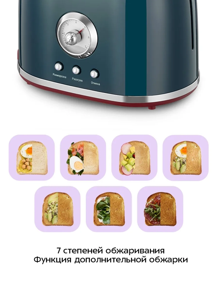 Тостер оснащен поворотным регулятором степени обжаривания и тремя кнопками. Режим разогрева служит для разогрева уже готовых тостов, если они остыли. Режим разморозки позволяет приготовить тосты из замороженного хлеба.