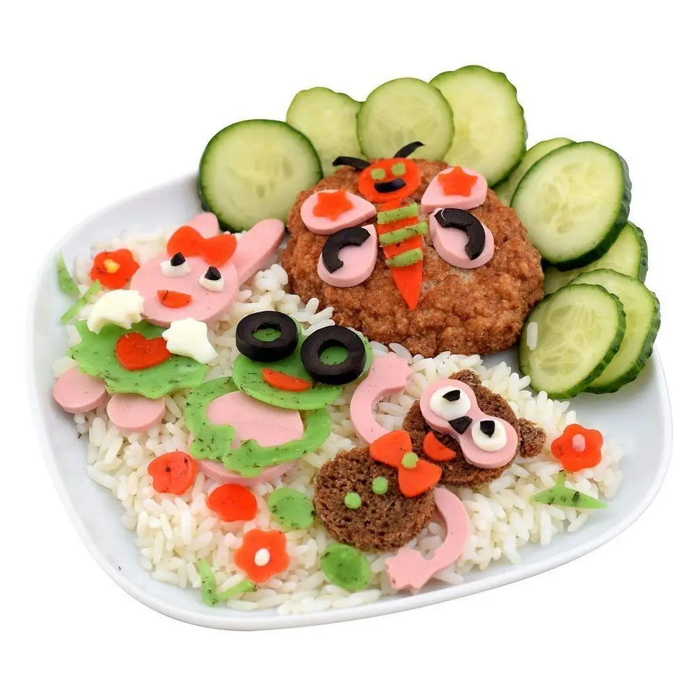 Трафарет предназначен для украшения блюд. С помощью него вы сможете украсить любое блюдо, придав ему индивидуальности. Можете вырезать фигурки из сыра, колбасы, овощей и украшать ими детские блюда или бутерброды. Это повысит интерес и аппетит у детей, которых порой очень сложно накормить. С помощью этого трафарета для декорирования Вы сможете украсить праздничный стол и удивить своих гостей оригинальностью замысла. Также трафарет подойдет для вырезания идеально ровных фигурок из мастики, марципана, теста и украшения ими выпечки. Привлекайте к украшению детей – превращайте этот процесс в настоящее творчество!