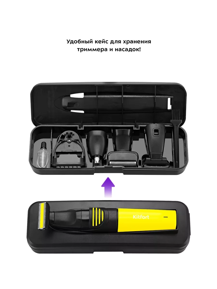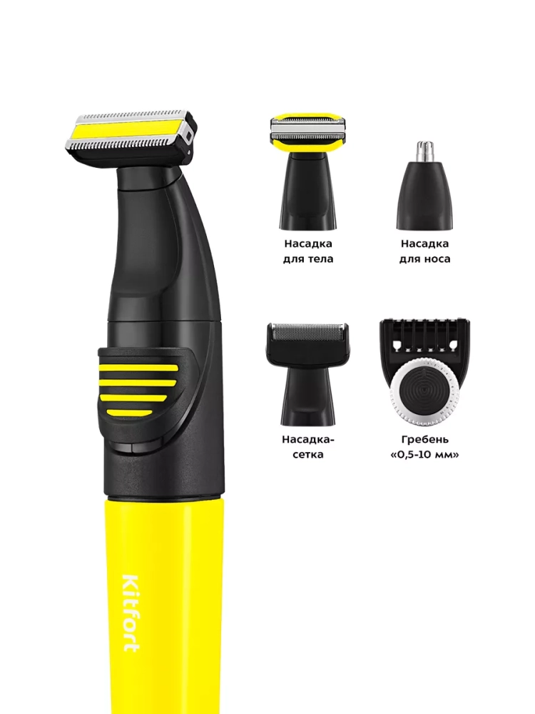 У триммера Китфорт КТ-3139 в комплект идет гребень с регулировкой длины, который рассчитан на стрижку коротких волос. Также в комплекте есть насадка для носа, которой также можно удалять волосы из ушей, насадка-сетка для бритья короткой щетины, насадка-триммер для бритья и подравнивания волос на лице и насадка для тела.