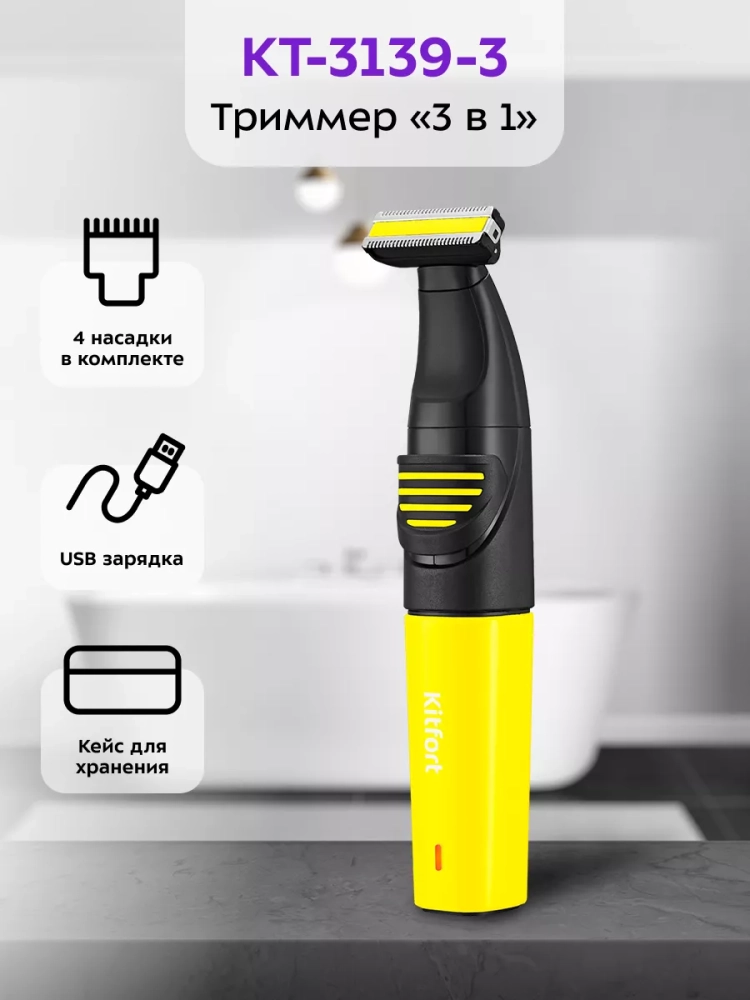 Триммер «3 в 1» Kitfort KT-3139 — это прибор для бритья, подравнивания и стрижки бороды, усов или бакенбард, а также для стрижки волос в носу и ушах.