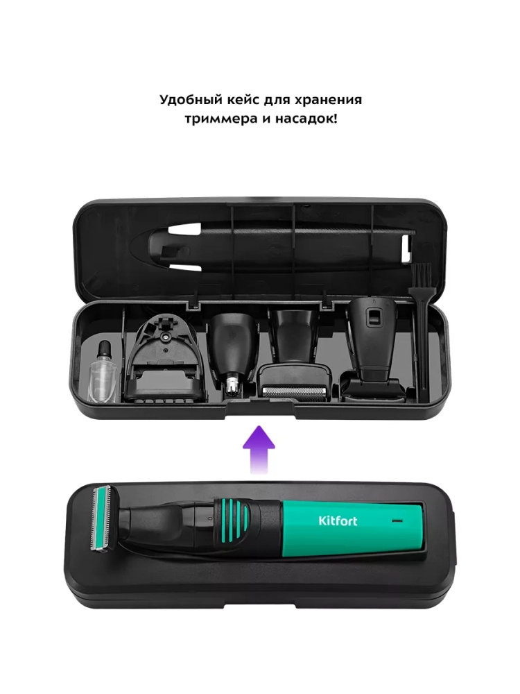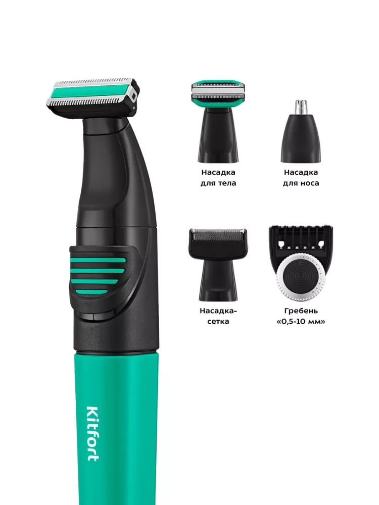 У триммера Китфорт КТ-3139 в комплект идет гребень с регулировкой длины, который рассчитан на стрижку коротких волос. Также в комплекте есть насадка для носа, которой также можно удалять волосы из ушей, насадка-сетка для бритья короткой щетины, насадка-триммер для бритья и подравнивания волос на лице и насадка для тела.