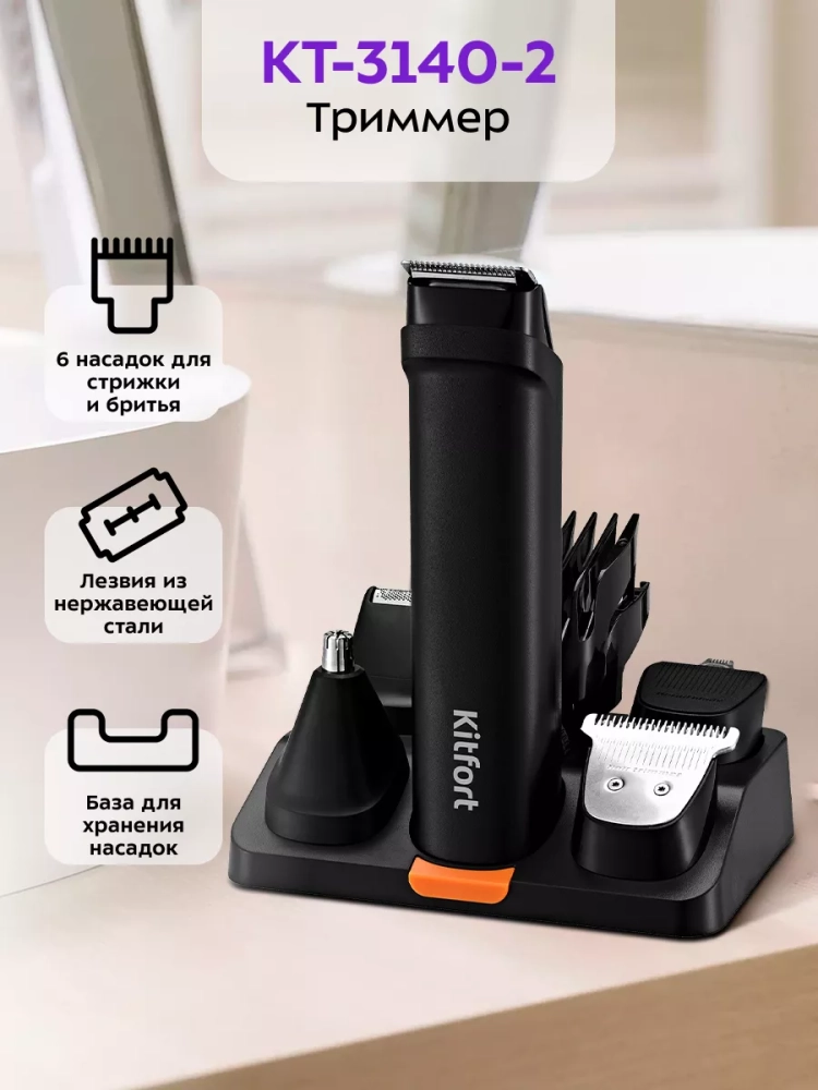 У триммера Китфорт КТ-3140 в комплект идут два гребня с регулировкой длины, которые рассчитаны на стрижку коротких волос. Также в комплекте есть насадка с широкими лезвиями для стрижки волос на голове, насадка с узкими лезвиями для стрижки волос на лице, насадка для носа, насадка для точной стрижки, которой вы с легкостью сможете подровнять брови или усы, а также насадка-сетка, которая рассчитана для бритья коротких волос на лице.