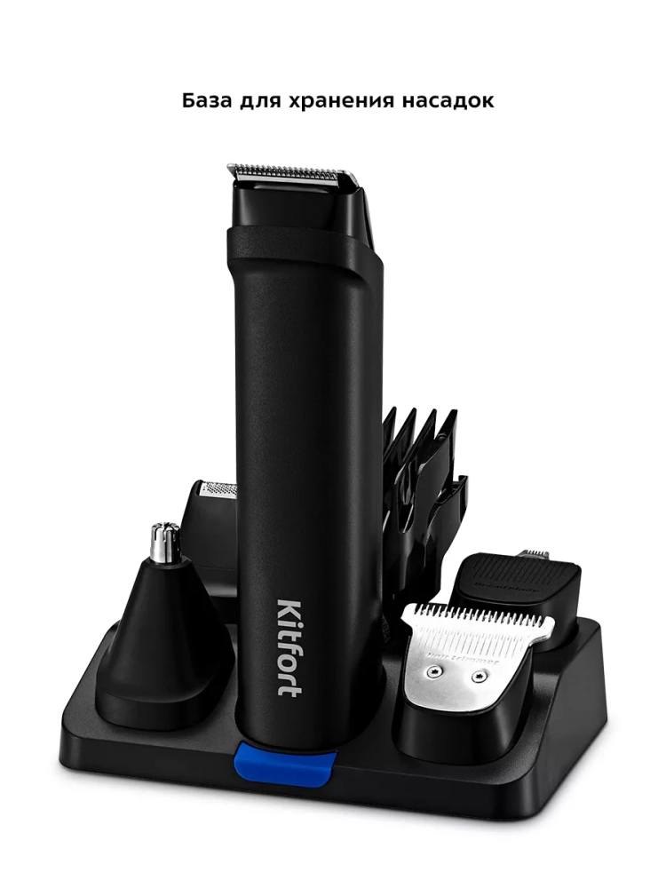 У триммера Китфорт КТ-3140 в комплект идут два гребня с регулировкой длины, которые рассчитаны на стрижку коротких волос. Также в комплекте есть насадка с широкими лезвиями для стрижки волос на голове, насадка с узкими лезвиями для стрижки волос на лице, насадка для носа, насадка для точной стрижки, которой вы с легкостью сможете подровнять брови или усы, а также насадка-сетка, которая рассчитана для бритья коротких волос на лице.