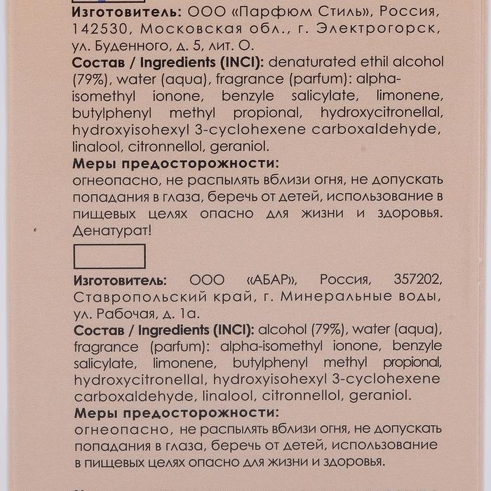 Состав: денатурированный спирт 80%, парфюмерная композиция 10%, вода 10%.