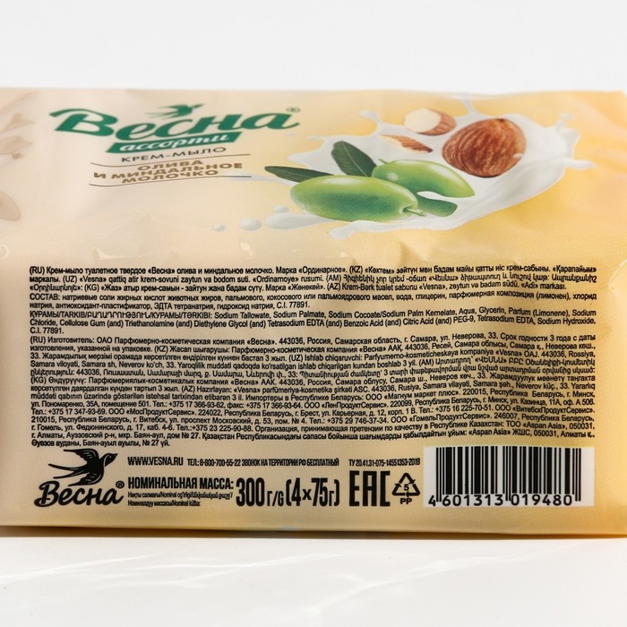 Туалетное мыло ВЕСНА, Олива и миндальное молочко. Бархатистая текстура мыла легко вспенивается и деликатно очищает кожу, окутывая её нежным ароматом. Нежная пена с легкостью смывается водой, позволяя коже дышать.