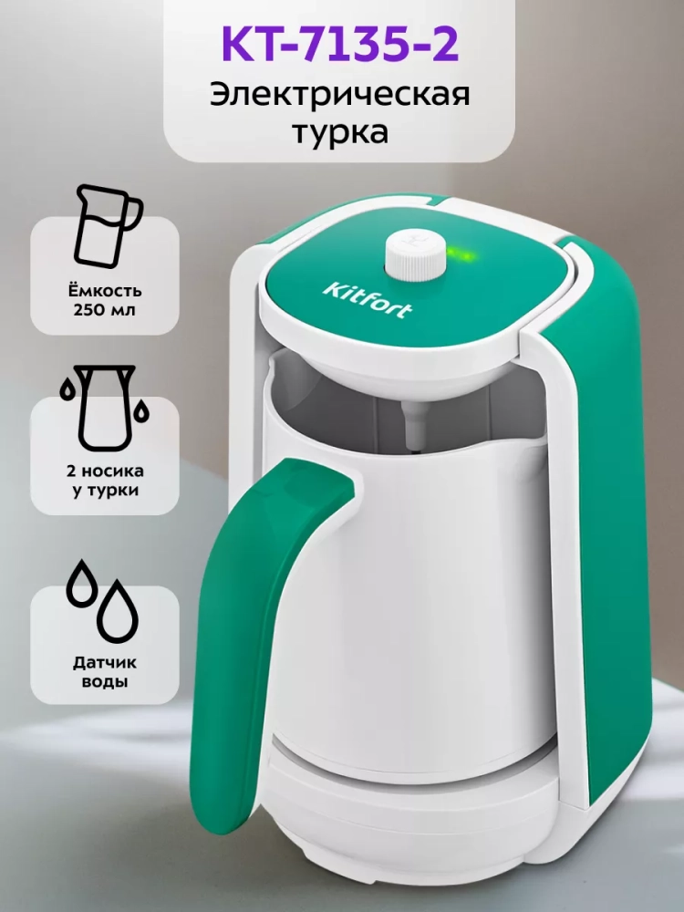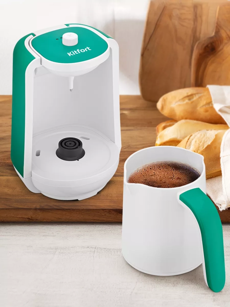 Электрическая турка Kitfort КТ-7135 варит кофе по-турецки. С ней вы сможете быстро и легко сварить натуральный кофе на 4 чашки по 60 мл.