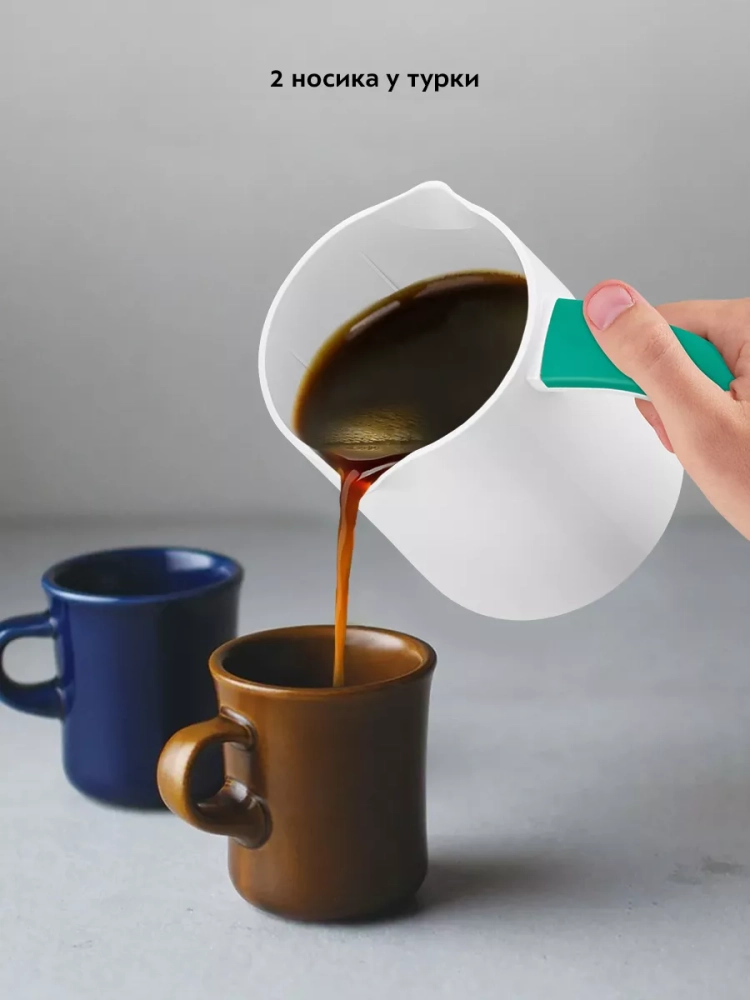 Ручка турки пластиковая, не нагревается и удобно лежит в руке. У турки 2 носика, это сделано специально, чтобы вам было удобно наливать кофе в чашку вне зависимости от того, правша вы или левша.