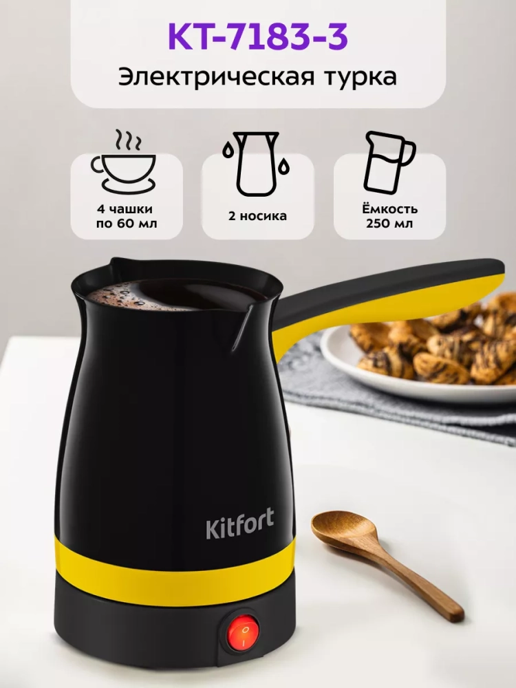 Электрическая турка Kitfort КТ-7183 варит кофе по-турецки. С ней вы сможете быстро и легко сварить натуральный кофе на 4 чашки по 60 мл. Устройство состоит из базы и турки.