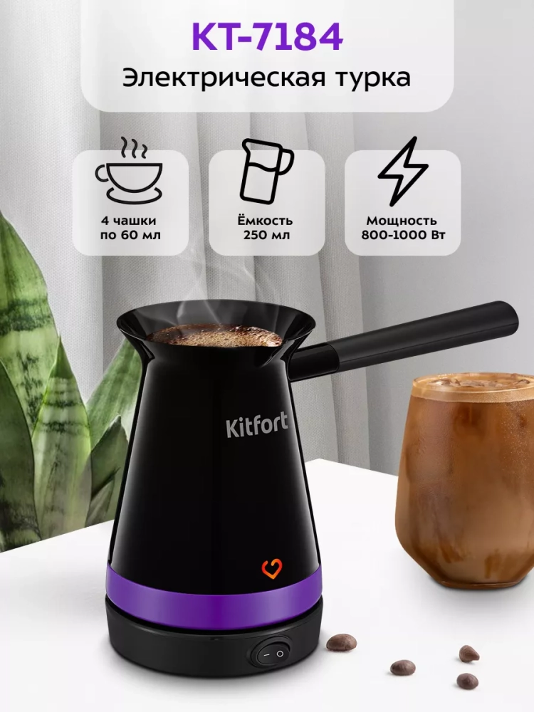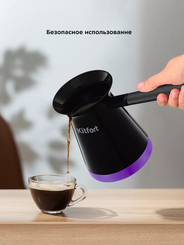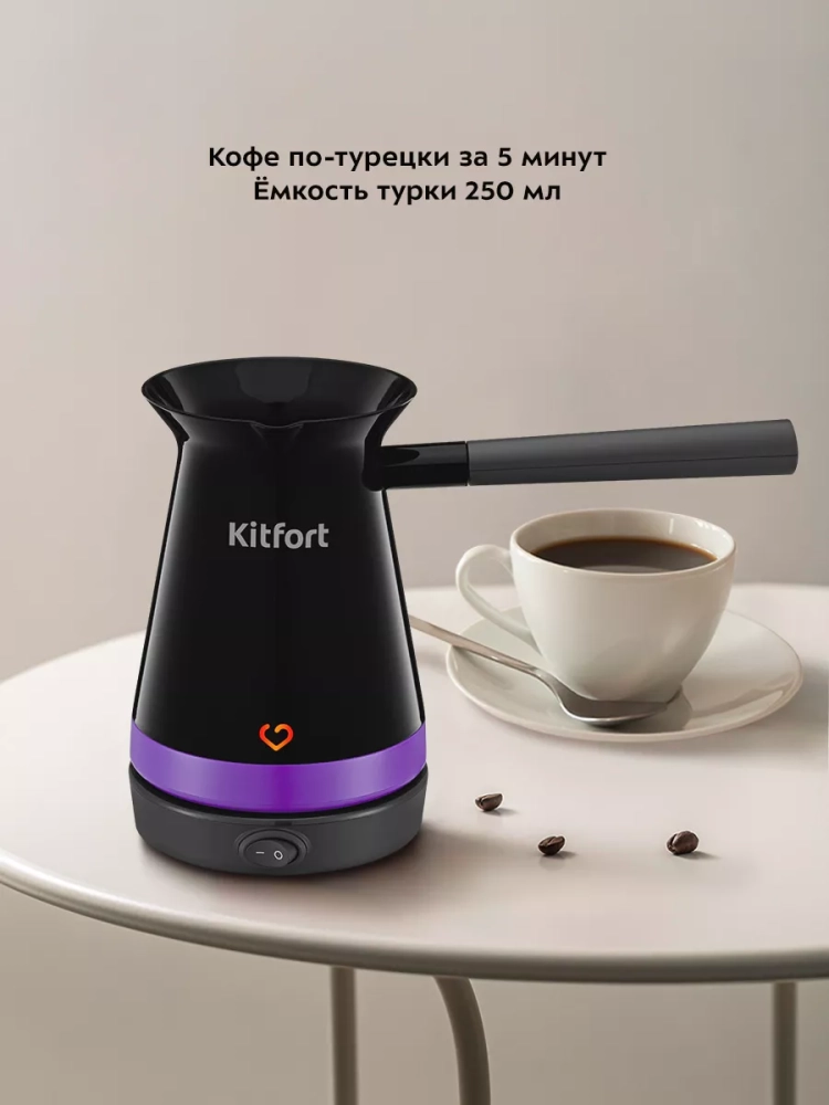 Электрическая турка для кофе Kitfort КТ-7184 – это идеальное решение для любителей кофе по-турецки. С помощью этой электротурки вы сможете быстро и легко приготовить натуральный кофе на 5 чашек по 50 мл. Устройство состоит из базы и турки, что делает его удобным в использовании. Турка электрическая позволяет варить кофе по-восточному, используя мелкомолотые зерна, которые заливаются водой и нагреваются почти до кипения. В процессе приготовления образуется пенка, которая придаёт напитку особый вкус. Эта электро кофеварка электрическая турка оснащена функцией автоотключения, что предотвращает "убегание" напитка через край при поднятии пенки. Это делает процесс приготовления безопасным и комфортным. Ручка турки выполнена из пластика, она не нагревается и удобно лежит в руке. Кофе по-турецки традиционно подается горячим в небольших чашках объемом около 60 мл. Напиток рекомендуется пить спустя некоторое время после наливания в чашку, чтобы кофейная гуща успела осесть на дно. Электротурка для кофе Kitfort КТ-7184 отличается стильным дизайном и высокой мощностью – 1000 Вт, что обеспечивает быстрое приготовление вашего любимого напитка. Эта джезва для кофе станет отличным дополнением к вашей кухне или офису. Если вы ищете надежную кофеварку электрическую для молотого кофе с функцией автоотключения – эта модель идеально подойдет вам! Турка электрическая для кофе с автоотключением обеспечит вам наслаждение ароматом свежесваренного напитка каждый день.