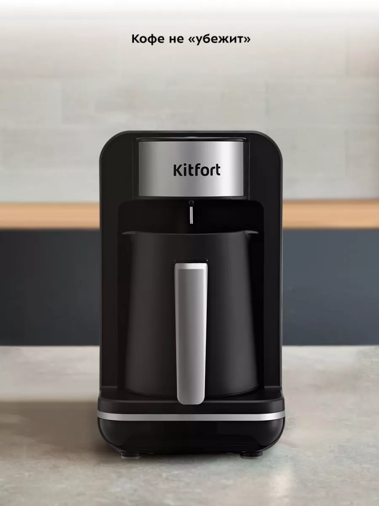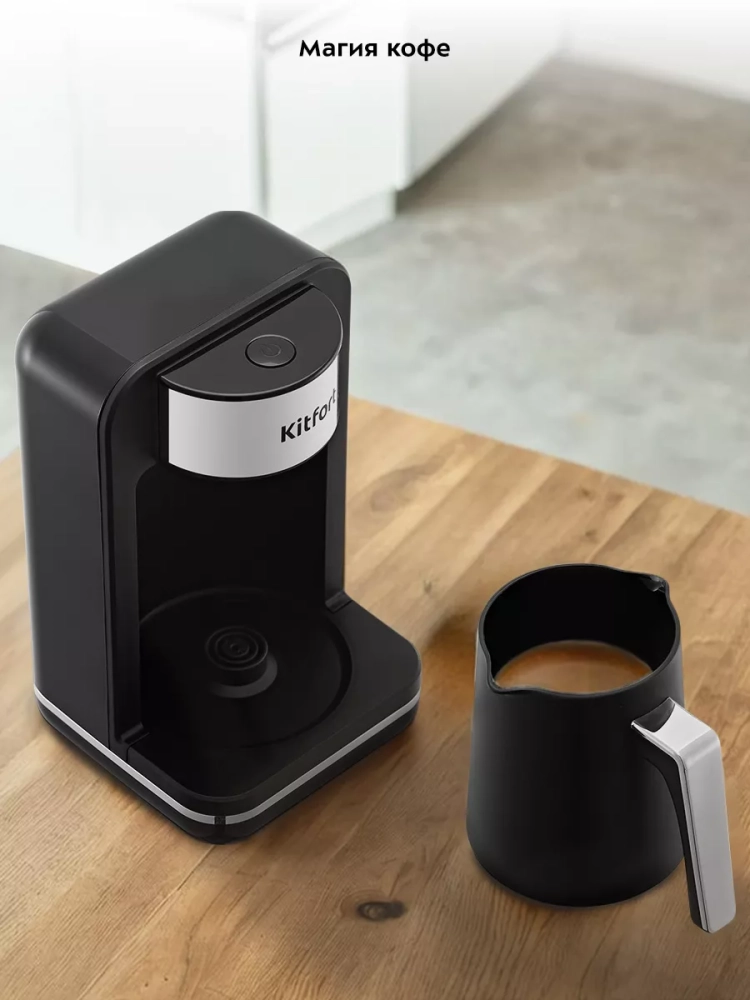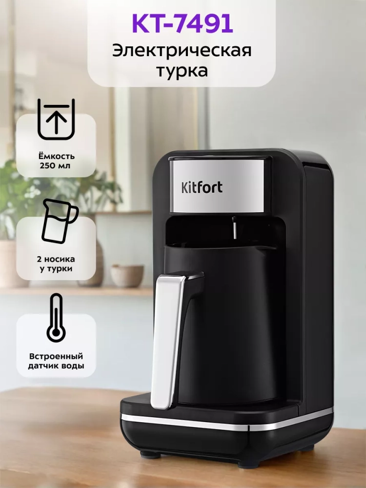 Электрическая турка Kitfort КТ-7491 варит кофе по-турецки. С ней вы сможете быстро и легко сварить натуральный кофе на 4 чашки по 60 мл. Кофе по-восточному или кофе по-турецки — кофе, приготовленный путем варки мелкомолотых зерен кофе в воде. Чтобы сварить кофе по-турецки, в турку засыпают молотый кофе, заливают воду и доводят ее до кипения. При этом образуется пенка. Если своевременно не прекратить нагрев, пенка перельется через край, кофе «убежит». В электрической турке КТ-7491 процесс варки кофе автоматизирован. Турка отключается прежде, чем кофе успеет закипеть. Чтобы пенка не перелилась через край, у электрической турки есть датчик температуры. Как только горячая пенка или вода коснется датчика, электрическая турка отключится. Датчик также нагревается паром, поэтому при малом объеме воды, пенка не коснется датчика, но пар нагреет его, и турка отключится. Кофе по-турецки подается горячим в небольших чашках (около 60 мл). Согласно традиции кофе пьют не сразу, как только его налили в чашку, а через некоторое время, когда кофейная гуща осядет на дно. Ручка турки пластиковая, она не нагревается и удобно лежит в руке. У турки 2 носика, это сделано специально, чтобы вам было удобно наливать кофе в чашку вне зависимости от того, правша вы или левша. Мерная ложка, поставляемая в комплекте, поможет отмерить и засыпать молотый кофе в турку. Электрическая турка состоит из базы и турки. Турка устанавливается на базу наподобие электрического чайника. Турка автоматически отключается благодаря датчику температуры: когда вода закипает, пар нагревает датчик, турка отключается. Если горячая вода или пенка коснутся датчика, турка также отключится. Турка рассчитана на 1–4 порции кофе. Мерная ложка поможет отмерить и засыпать нужное количество молотого кофе. Напряжение: ~220–240 В, 50/60 Гц. Класс защиты от поражения электрическим током: I. Длина шнура: 0,9 м. Размер устройства: 140 х 174 х 245 мм.