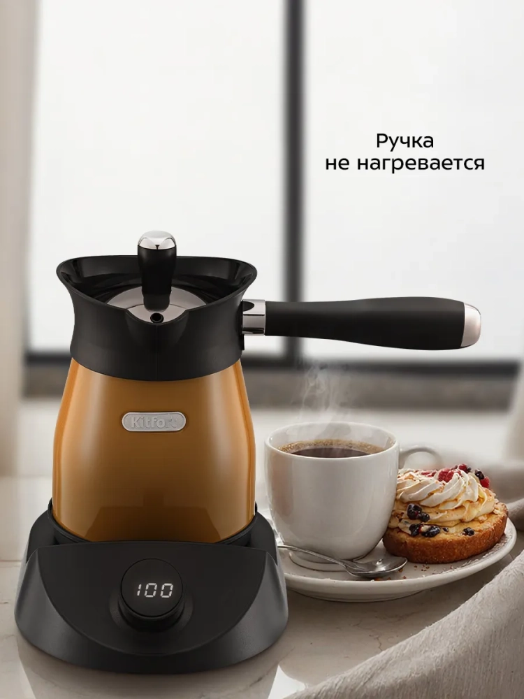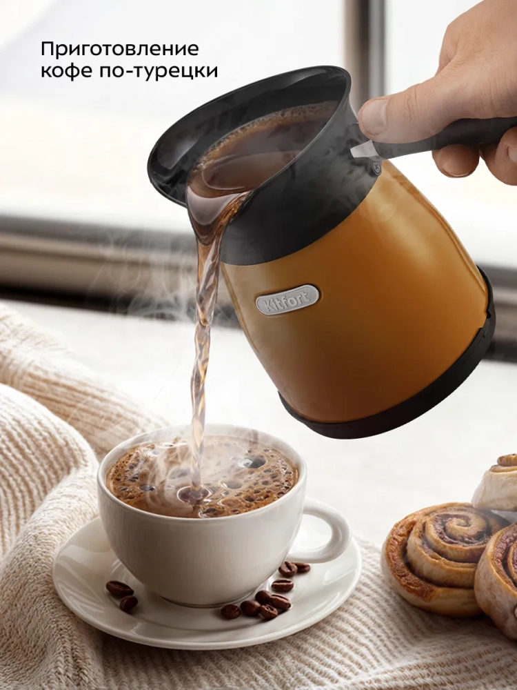 Электрическая турка Kitfort КТ-7498 варит кофе по-турецки. С ней вы сможете быстро и легко сварить натуральный кофе на 5 чашек по 60 мл. Устройство состоит из базы и турки.