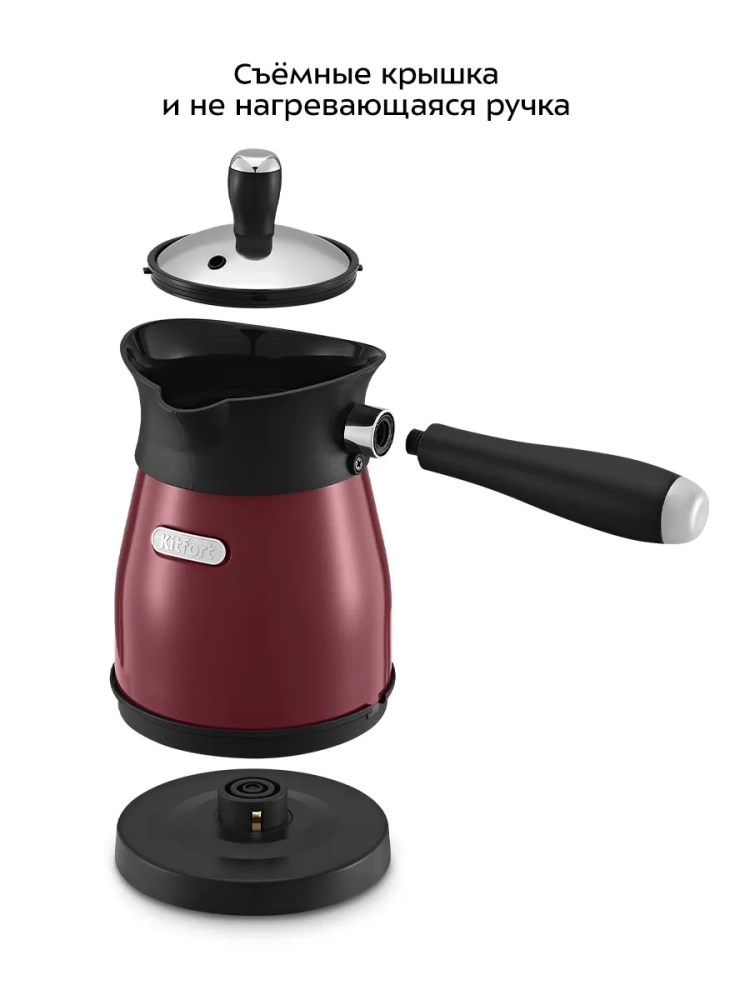 Электрическая турка Kitfort КТ-7499 варит кофе по-турецки. С ней вы сможете быстро и легко сварить натуральный кофе на 5 чашек по 60 мл. Устройство состоит из базы и турки.