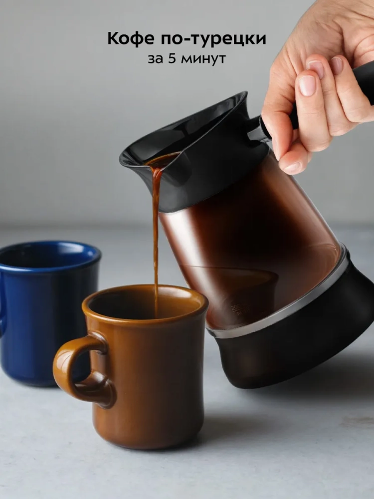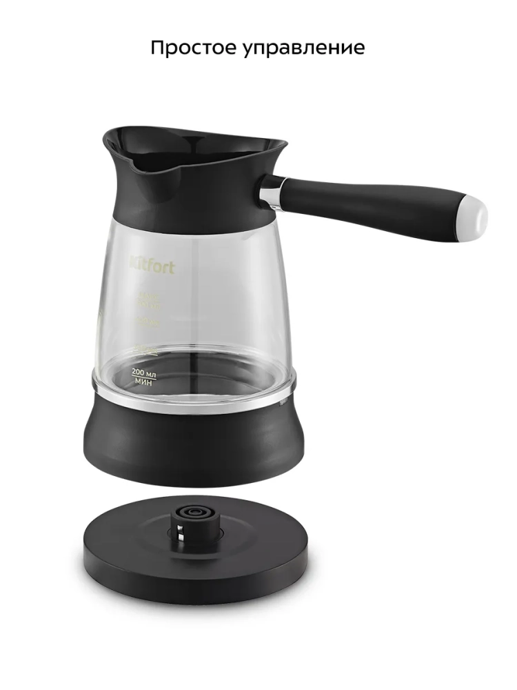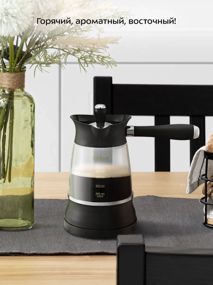 Электрическая турка Kitfort КТ-7502 варит кофе по-турецки. С ней вы сможете быстро и легко сварить натуральный кофе на 8 чашек по 60 мл. Устройство состоит из базы и турки.
