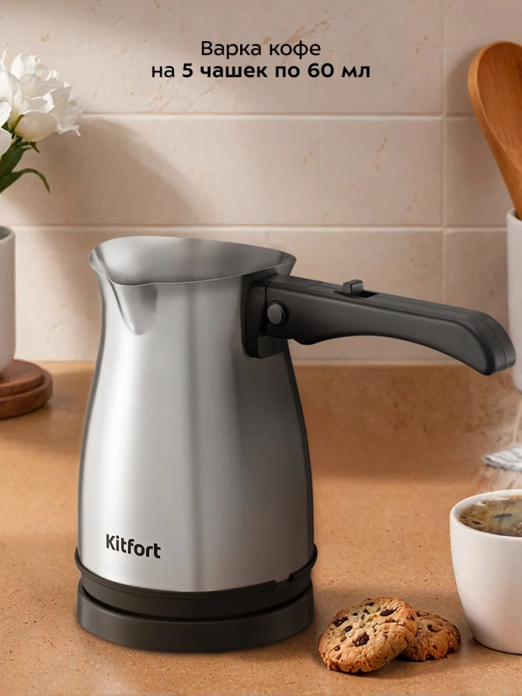 Электрическая турка Kitfort КТ-7525 варит кофе по-турецки. С ней вы сможете быстро и легко сварить натуральный кофе на 5 чашек по 60 мл. Устройство состоит из базы и турки.