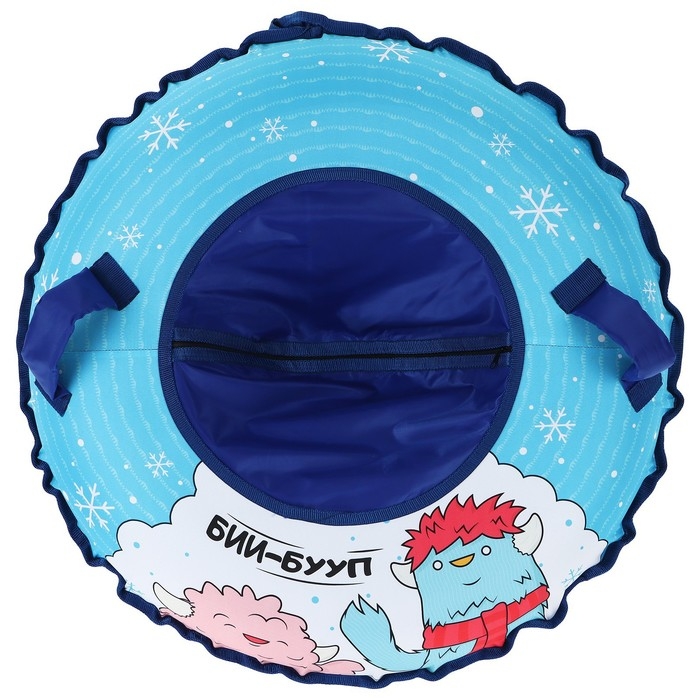Дно тюбинга изготовлено из тентовой ткани, что гарантирует долгий срок службы и обеспечивает отличное скольжение. Тюбинг оснащён безопасными ручками и молнией для быстрого доступа к камере. Имеет закрытую сердцевину, что исключает попадание снега внутрь. Фактический размер накачанного тюбинга зависит от температуры внешней среды и давления в камере. Для тюбинга подойдёт камера 14 дюймов. Предназначен для детей от 3 лет.
