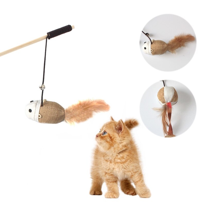 Удочка дразнилка (деревянная) с мышкой и колокольчиком для кошек из натуральных материалов.