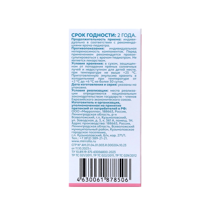 Способ применения: продукт принимать по рекомендации врача-педиатра. Перед употреблением взболтать продукт. Детям с первых дней жизни по 10 капель перед каждым кормлением (эмульсию добавлять в воду, молоко, молочную смесь).