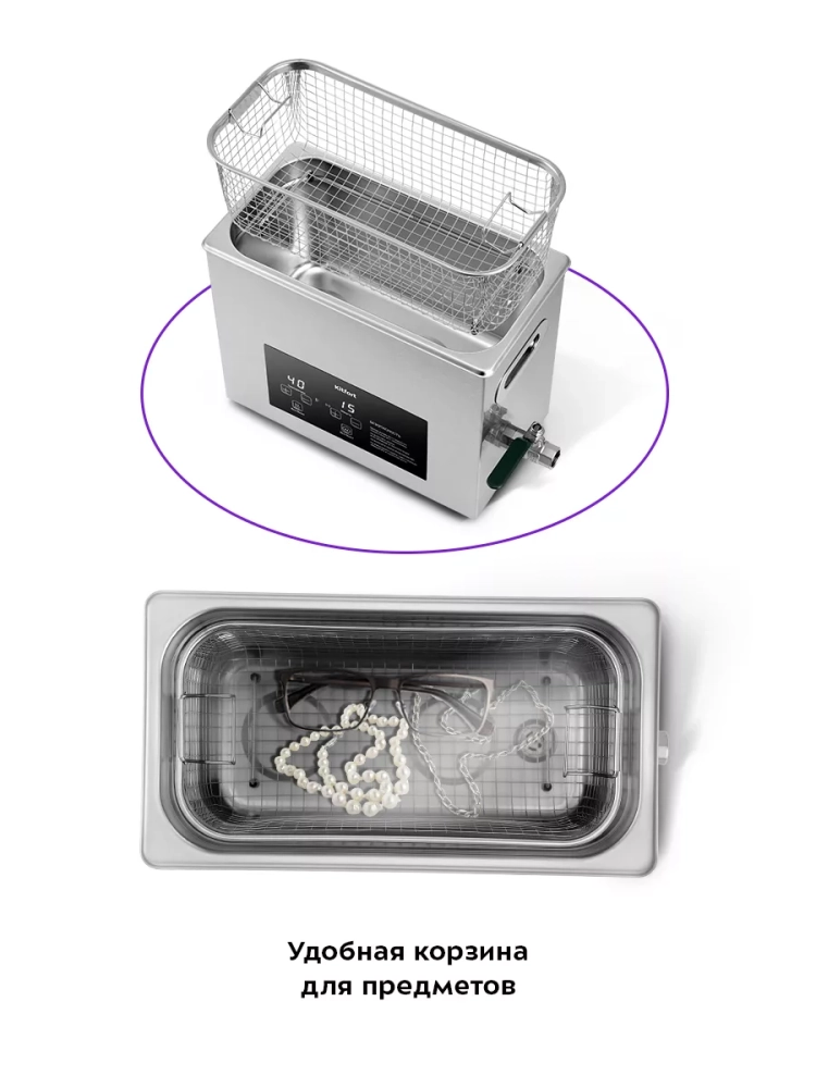 Корпус прибора, крышка и резервуар сделаны из нержавеющей стали. Благодаря большому размеру вы можете очищать более крупные предметы или много небольших предметов за 1 раз.