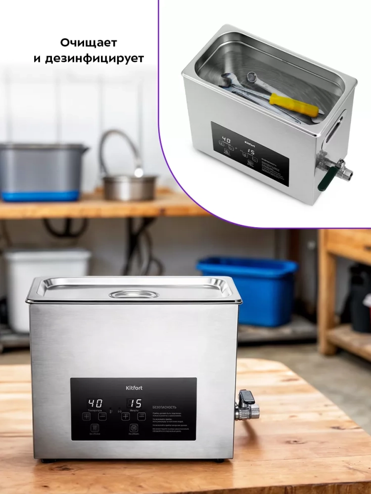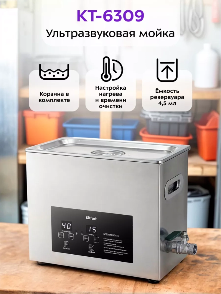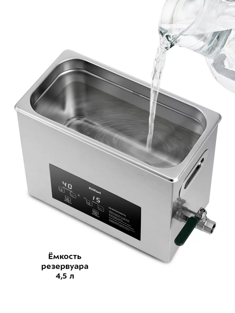 Ультразвуковая мойка Kitfort КТ-6309 поможет эффективно очистить и продезинфицировать различные изделия из металла, пластика и стекла. Ультразвуковая очистка — способ очистки поверхности твёрдых тел в жидкости, при котором в жидкость вводятся ультразвуковые колебания. Применение ультразвука значительно ускоряет процесс очистки и повышает качество очистки. В качестве жидкости в ультразвуковой мойке можно использовать воду, а также специальные чистящие или дезинфицирующие растворы.