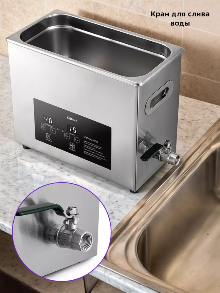 Емкость резервуара для воды составляет 5 л, поэтому ультразвуковая мойка с полным резервуаром для воды очень тяжелая. Чтобы слить воду или чистящее средство из резервуара для воды сбоку предусмотрен кран. Вы можете расположить ультразвуковую мойку рядом с раковиной или подставить под кран пустую емкость и открыть его.