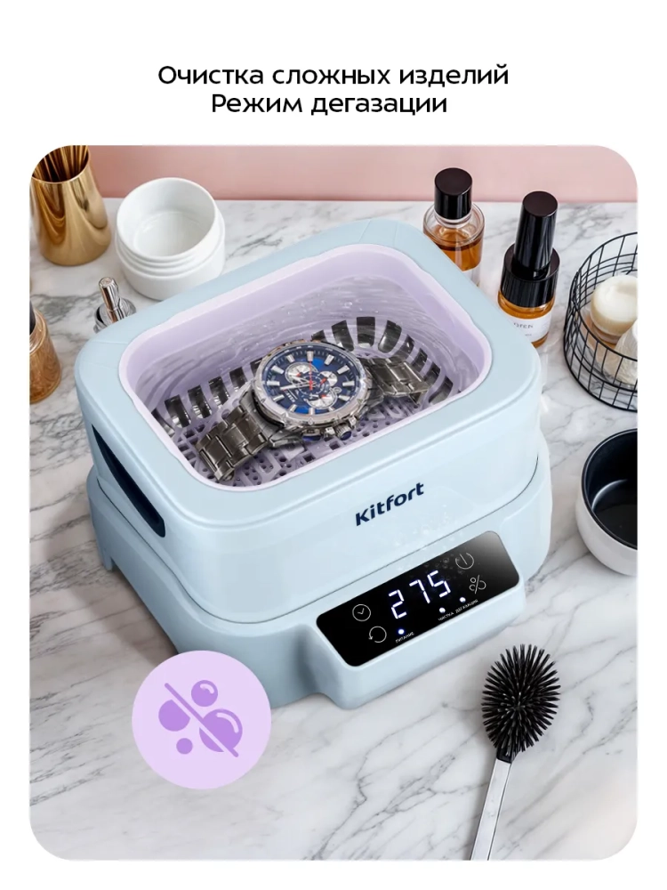 Ультразвуковая мойка Kitfort КТ-6450 поможет эффективно очистить небольшие изделия из металла, пластика и стекла. Ультразвуковая очистка — способ очистки поверхности твёрдых тел в жидкости, при котором в жидкость вводятся ультразвуковые колебания. Применение ультразвука значительно ускоряет процесс очистки и повышает качество очистки. В качестве жидкости в ультразвуковой мойке можно использовать воду, а также чистящие или дезинфицирующие растворы.