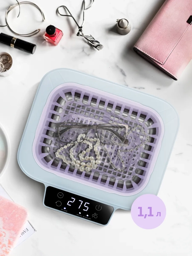 Корпус прибора и подставка сделаны из пластика, а резервуар, в который помещаются предметы для очистки, — из нержавеющей стали. Через прозрачную крышку вы можете наблюдать за процессом чистки.