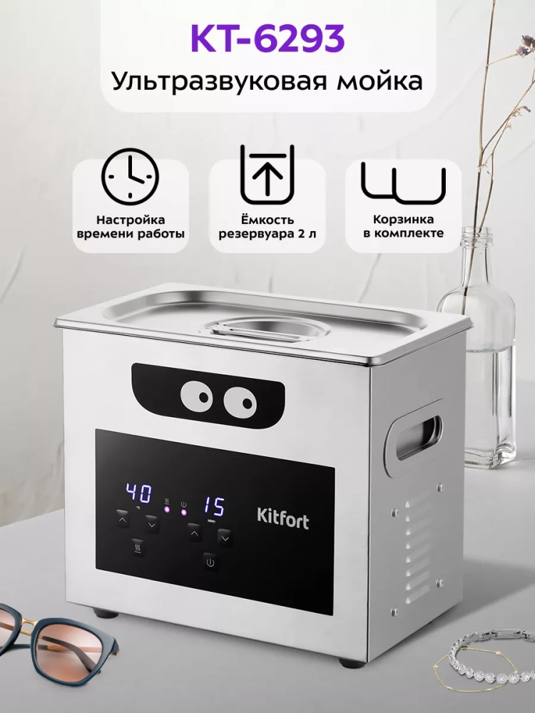 Ультразвуковая мойка Kitfort КТ-6293 поможет эффективно очистить и продезинфицировать небольшие изделия из металла, пластика и стекла. Ультразвуковая очистка — способ очистки поверхности твёрдых тел в жидкости, при котором в жидкость вводятся ультразвуковые колебания. Применение ультразвука значительно ускоряет процесс очистки и повышает качество очистки. В качестве жидкости в ультразвуковой мойке можно использовать воду, а также чистящие или дезинфицирующие растворы.